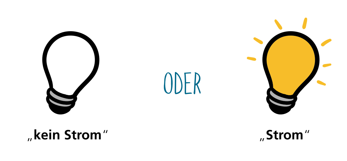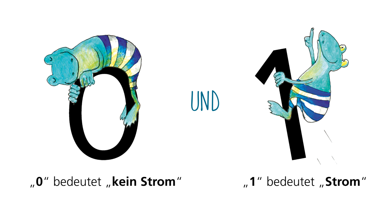 Ein Computer kann nur zwei Zustände unterscheiden: „Kein Storm“ und „Strom“. In der Computersprache sind das die Zahlen 0 und 1. 0 bedeutet „kein Strom“ und 1 bedeutet „Strom“. Ein Computer „denkt“ also nur in den Zahlen 0 und 1. Das nennt man auch „binäres Zahlensystem“. Es ist quasi die Sprache des Computers. Alles, was wir auf dem Computer sehen oder hören (Texte, Filme, Musik, ...) speichert der Computer mit Hilfe dieser zwei Zahlen! Sogar jeder Buchstabe hat eine eigene Zahlenkombination aus 0 und 1.