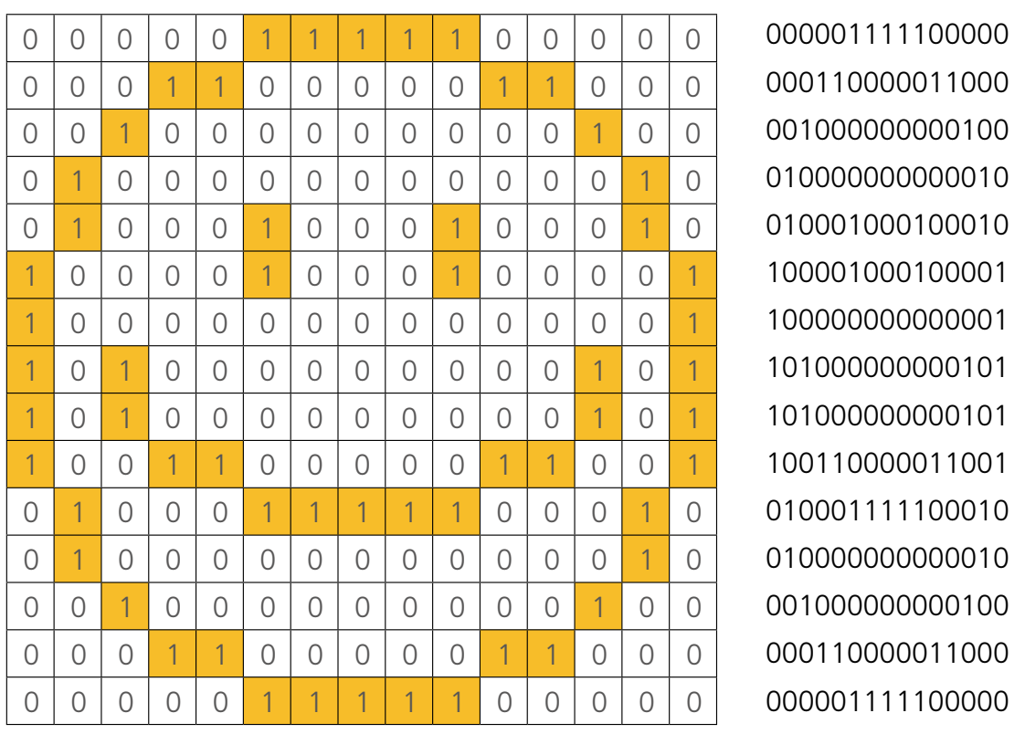 Für jedes Bildteil merkt sich der Computer eine Zahlenkombination aus 0 und 1. Der Computer muss wissen, ob der Bildteil zum Beispiel färbig ist oder nicht. Weiße Bildteile beschreibt er mit 0 und färbige mit 1. Das sieht dann zum Beispiel so aus: